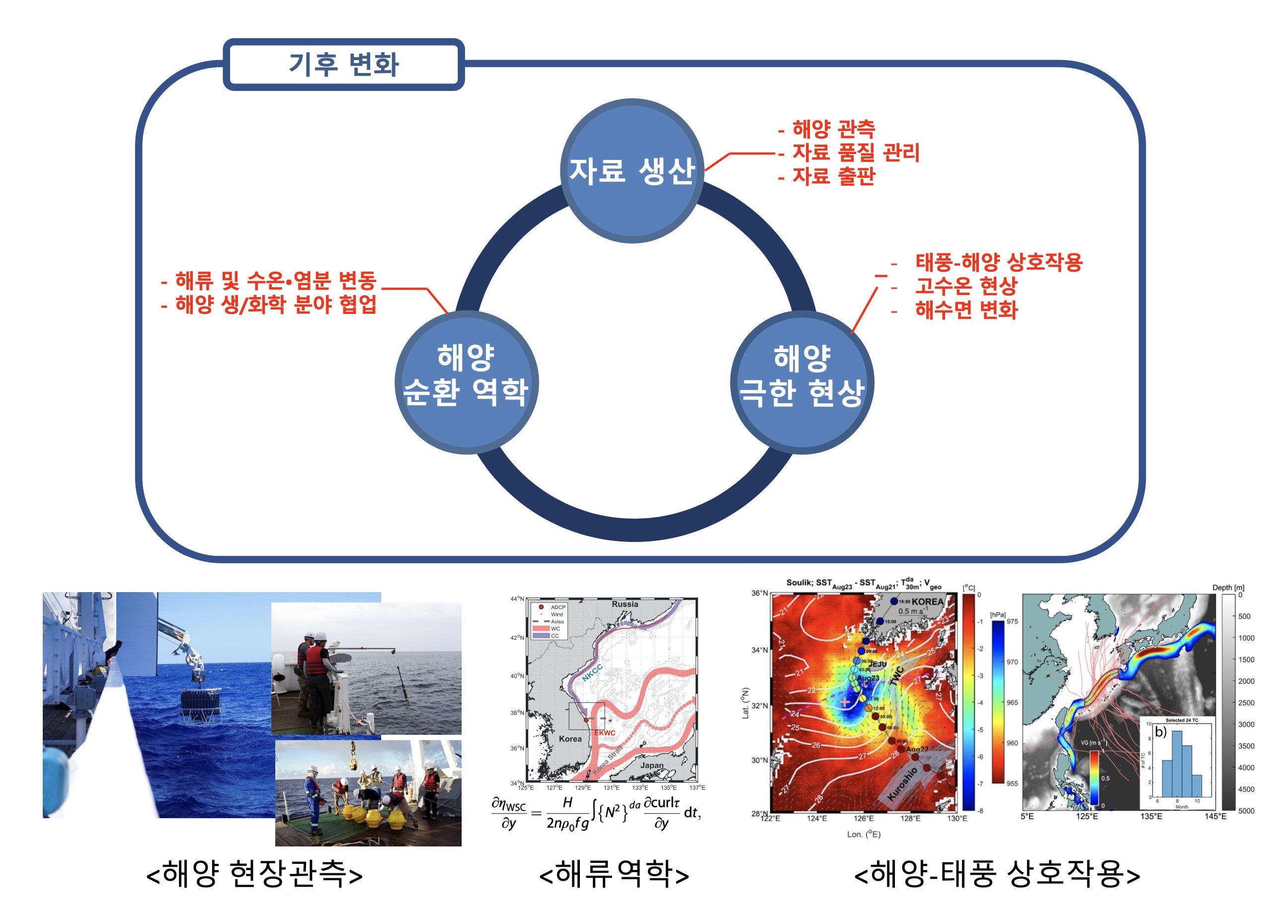 우리 연구실은 최근 가속화되고 있는 기후변화 속에서 바다의 끊임없는 움직임과, 온도·염분 변화가 어떻게 일어나는지 직접 바다로 나가 관측을 하고, 이를 기반으로 물리 법칙이라는 도구를 통해 바다의 변화를 이해하고, 이를 다른 과학자들과 나누는 법을 배우는 곳입니다.