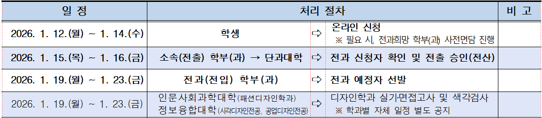2026학년도 1학기 전과 예정자 선발 계획을 다음과 같이 안내드립니다. 가. 지원자격: 1개 학기 이상 이수자(편입생 동일) ※ 1학년 학부 소속 학생: 소속 학부 → 타 학부 또는 타 학과로 전과 나. 접수기간: 2026. 1. 12.(월) 09:00 ~ 1. 14.(수) 18:00 다. 추진 일정